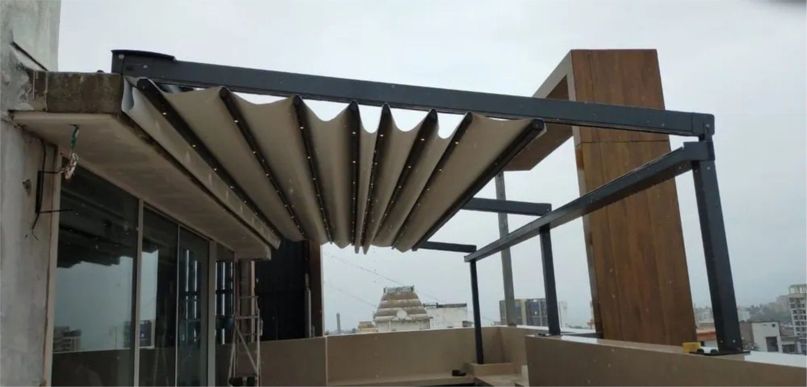 Combining structure with soft fabric, these pergolas create inviting outdoor spaces with adjustable shading options.
